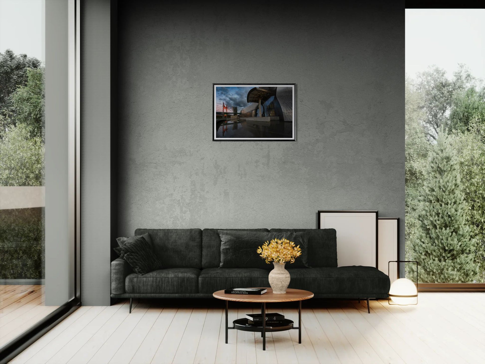 This atmospheric close-up captures the Guggenheim Museum in Bilbao at dusk, where the building’s gleaming titanium curves meet the soft hues of the evening sky. The reflections on the calm water and the glow of the nearby bridge create a sense of mystery and depth, highlighting the museum’s bold, sculptural form. A captivating piece that celebrates architecture, light, and the poetic beauty of modern design.