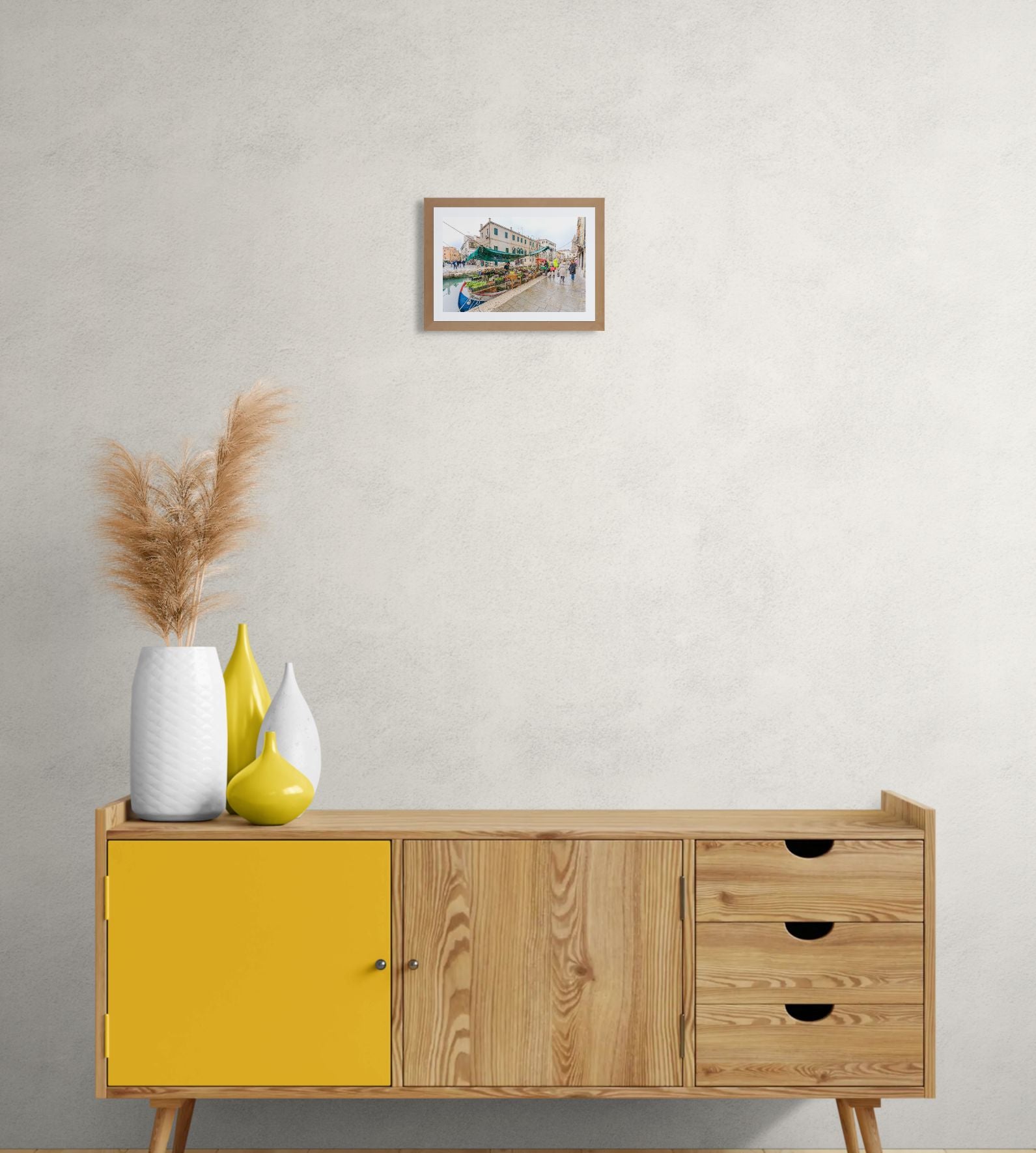 This vibrant photograph captures a classic Venetian scene: a rustic boat docked along a narrow canal, overflowing with fresh fruits and vegetables. Set against the backdrop of weathered brick walls and calm water, the floating market brings everyday life in Venice to the forefront—colorful, authentic, and full of character. A perfect piece for lovers of travel, Italian culture, food photography, and the charm of real street life in Venice.